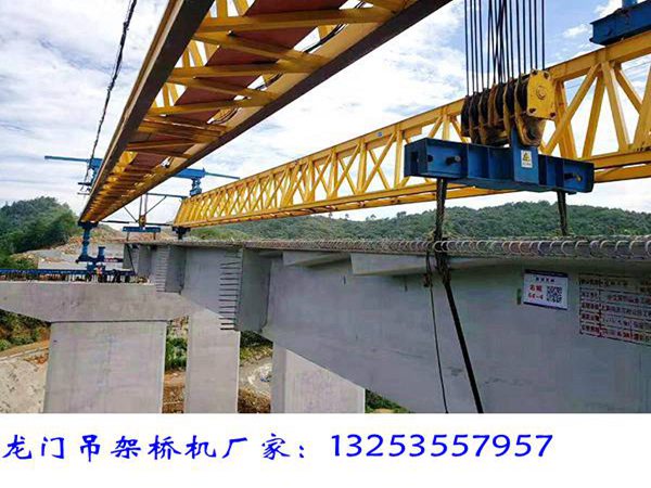 架橋機在過下導梁時應注意的問題:后支腿(O型腿)要墊起,使四個墊墩著地受力,并用錨固螺桿錨固。要確定前支腿垂直受力,輔支腿懸掛輪和下導梁兩邊間隙均勻。操作手要確定遙控器(操作手柄)選擇正確前吊梁與輔支腿一同運送下導梁時,要有專人看護前吊梁行車與輔支腿下 電機走行狀況。注意同步問題。下導梁就位時中心線要與橋機中心線對齊。